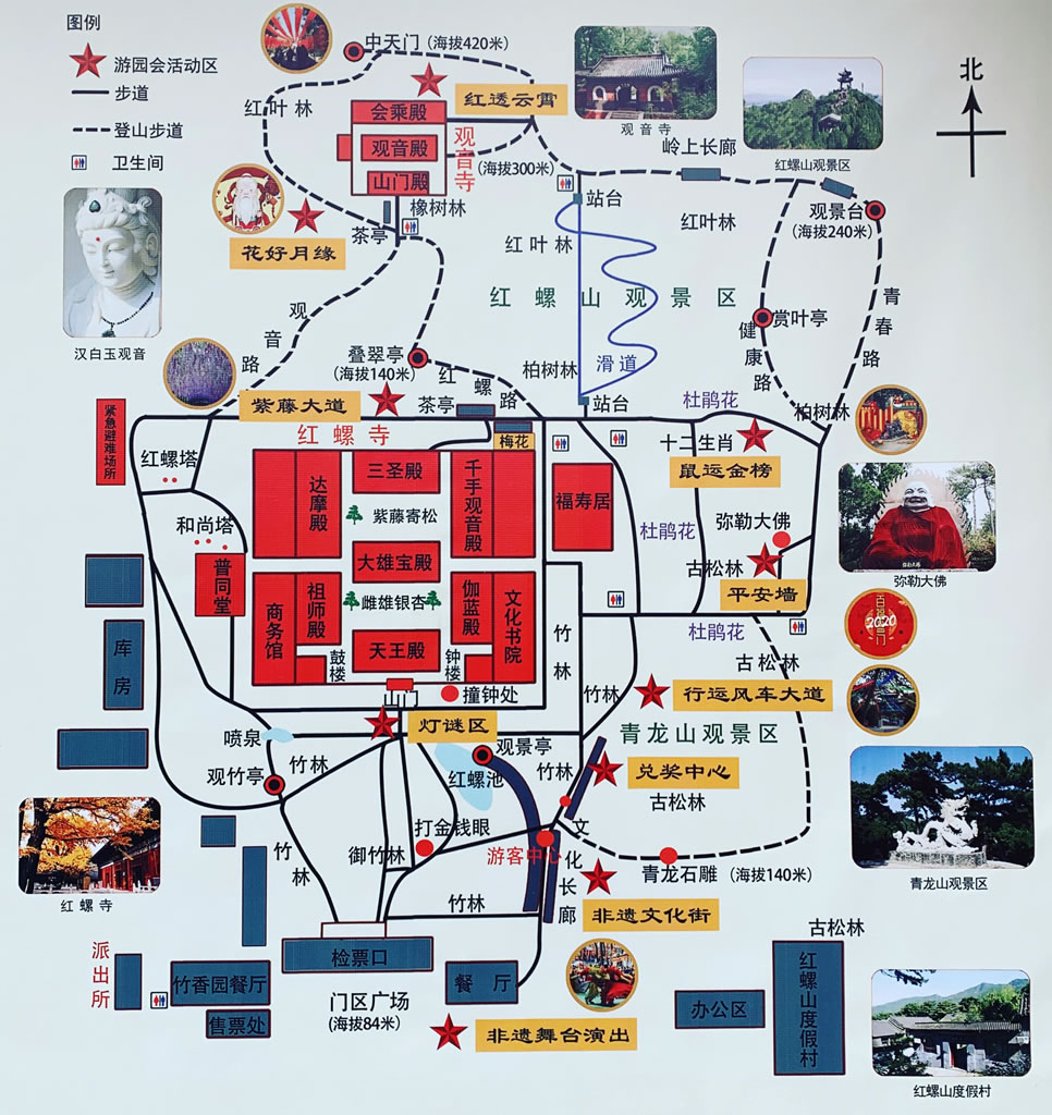 旅游區(qū)環(huán)境幽雅,古木參天,經(jīng)年常青,四季花香,人文景觀與自然景觀競(jìng)秀。紫藤寄松、御竹林、雌雄銀杏號(hào)稱三絕景;寺西之珍珠泉,碧透似鏡,沸泡如珠,有神泉之稱;寺南之紅螺湖,水波蕩漾,溢彩流光,是一個(gè)劃船、游泳、垂釣的好去處。景區(qū)經(jīng)多年開發(fā)建設(shè),逐步形成了“吃、住、行、游、購、娛”于一體的、綜合配套設(shè)施完備的旅游度假風(fēng)景區(qū)。 |