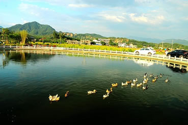 臺灣度假村位于長潭旅游區(qū)入口處的虎形山,占地面積218畝,主要開發(fā)廣場、朝圣區(qū)、游樂園、賓館、別墅、展覽館、科技城、美食一條街、農(nóng)業(yè)觀光和苗圃等項目。為一富娛樂性、知識性、觀賞性之休閑場所。1998年11月動工,1999年,度假村建成戲水樂園、滑草坪、親子園地、世界蝴蝶館,此館擁有全國最多的蝴蝶種類,為廣東省最大最具規(guī)模的觀賞樂園。此外還成功引種臺灣名優(yōu)稀特水果火龍果。臺灣度假村風光旖旎,富有詩情畫意,依山構(gòu)筑的山門別具一格,其景觀廣場、游樂園、朝圣區(qū)、科技城錯落在山水、綠樹之間,水色塋潔,光可照人。