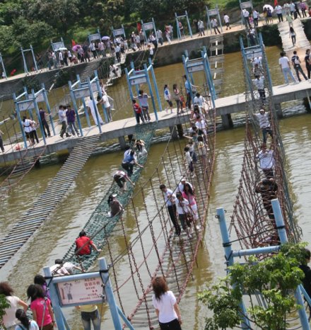 拓展訓(xùn)練基地占地面積10余畝,是深圳市青少年生存能力素質(zhì)教育基地,分為水上游樂區(qū)、高空拓展區(qū)與兒童游樂區(qū)。特別是水上游樂區(qū)涵蓋了霹靂滾桶、魔鬼車輪、木樁功夫橋和鐵鎖吊橋等有趣刺激拓展運動項目。您既可以在青山綠水中盡情呼吸新鮮空氣,又可以在動感十足的拓展項目中挑戰(zhàn)自我,體驗這一風(fēng)靡全球的拓展運動帶給你的無限快樂。項目網(wǎng)羅: 霹靂滾桶、魔鬼車輪、秋千橋 、連環(huán)獨木橋 、木樁功夫橋、 空中獨木橋、園木云梯橋、鐵鎖晃橋、長板坡 、 云梯橋 、鐵鎖鋼絲橋 、天羅地網(wǎng)、云梯功夫橋 、鐵鎖吊橋、 木樁功夫橋、水上漂 、鐵鎖橋、 一線鐵鎖橋 一線鐵鎖橋 、九曲獨木橋 、踏水無痕 、向風(fēng)起舞 、鐵甲四強等。