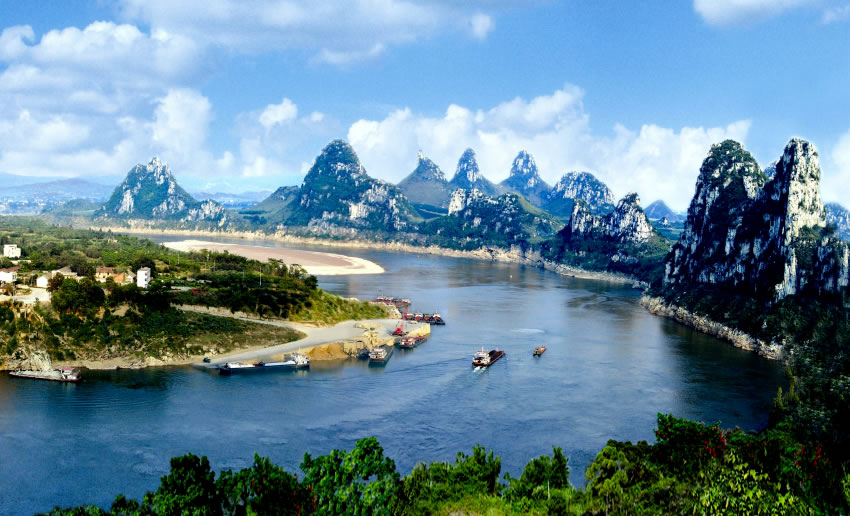 五馬攔江,位于武宣縣城南郊,黔江南岸有5座弧列的山巒,活似5匹駿馬,將黔江截?cái)r,強(qiáng)令黔江水繞東流,氣壯山河,江山輝映,景色迷人。在5匹駿馬之間,聳立一座竹筍狀的文筆峰,面對(duì)江中200余米長的橢圓形沙洲,俗稱:“古磧?yōu)?rdquo;,是武宣縣老八景之一—《古磧鐘聲》。昔日江水擊洲,聲如鐘鳴。