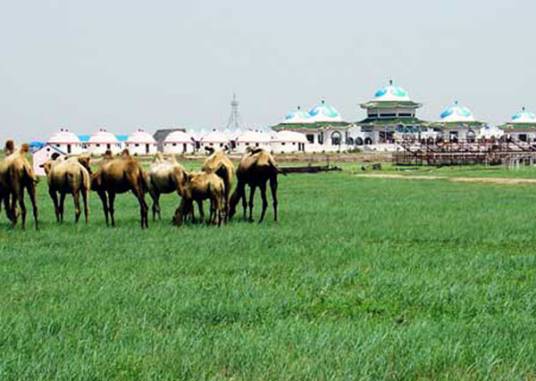 旅游區(qū)占地6000畝,總建筑面積為3260平方米,整體設(shè)計(jì)突出民族特色;五個殿堂式迎賓包,坐落在1.3米高的平臺上,氣勢磅礴,造型典雅,富麗堂皇,兩側(cè)是18個豪華型固定包和14個傳統(tǒng)氈包,組成蒙古包群。建筑的正南面是周長為1000米的賽馬場,通遼市一年一度的賽馬節(jié)就在這里舉行。