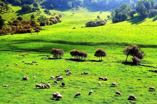 群山競(jìng)秀,溪壑密布,林木參天,草場(chǎng)綿延不絕。森林沿圓潤(rùn)柔和的山體從上到下呈放射狀分布,與廣闊肥腴的草原相間,形成了獨(dú)特的地理形態(tài)。組成草原的山巒重重疊疊,蜿蜒起伏,和舒緩寬闊的山谷坡地密切銜接,延綿不斷。幽澗水澤穿行于腹地,或囤積成片分布在大大小小的草坡上,或森林間,使得草原地面表層常年濕潤(rùn)無(wú)比。春秋季節(jié),游人絡(luò)繹不絕的蜂擁而至,踩在青翠碧綠的草面上,常會(huì)為被地表的柔軟和從鞋子周圍緩緩溢出的水感到驚訝。由于受垂直地帶性地理?xiàng)l件的影響,終年氣溫較低,春秋相連,冬長(zhǎng)無(wú)夏,素有“關(guān)山六月猶凝霜”的寫(xiě)照。因其地貌酷似中歐的阿爾卑斯山,故有些旅游資料上稱其是“具有歐式風(fēng)情的游覽勝地”。