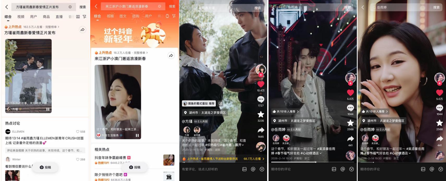 微短劇《這個(gè)春節(jié),和“xx”一起過(guò)年》,讓太湖龍之夢(mèng)在這個(gè)春節(jié)多了一層身份,它不只是景區(qū),更是演員們演繹人間煙火的敘事背景。太湖龍之夢(mèng)與抖音生活服務(wù)深度合作,讓岳雨婷、崔雨鑫等演員拍攝系列微短劇,把龍之夢(mèng)“江浙滬小澳門”的社交標(biāo)簽,打碎了揉進(jìn)愛(ài)情與友情的敘事褶皺里。