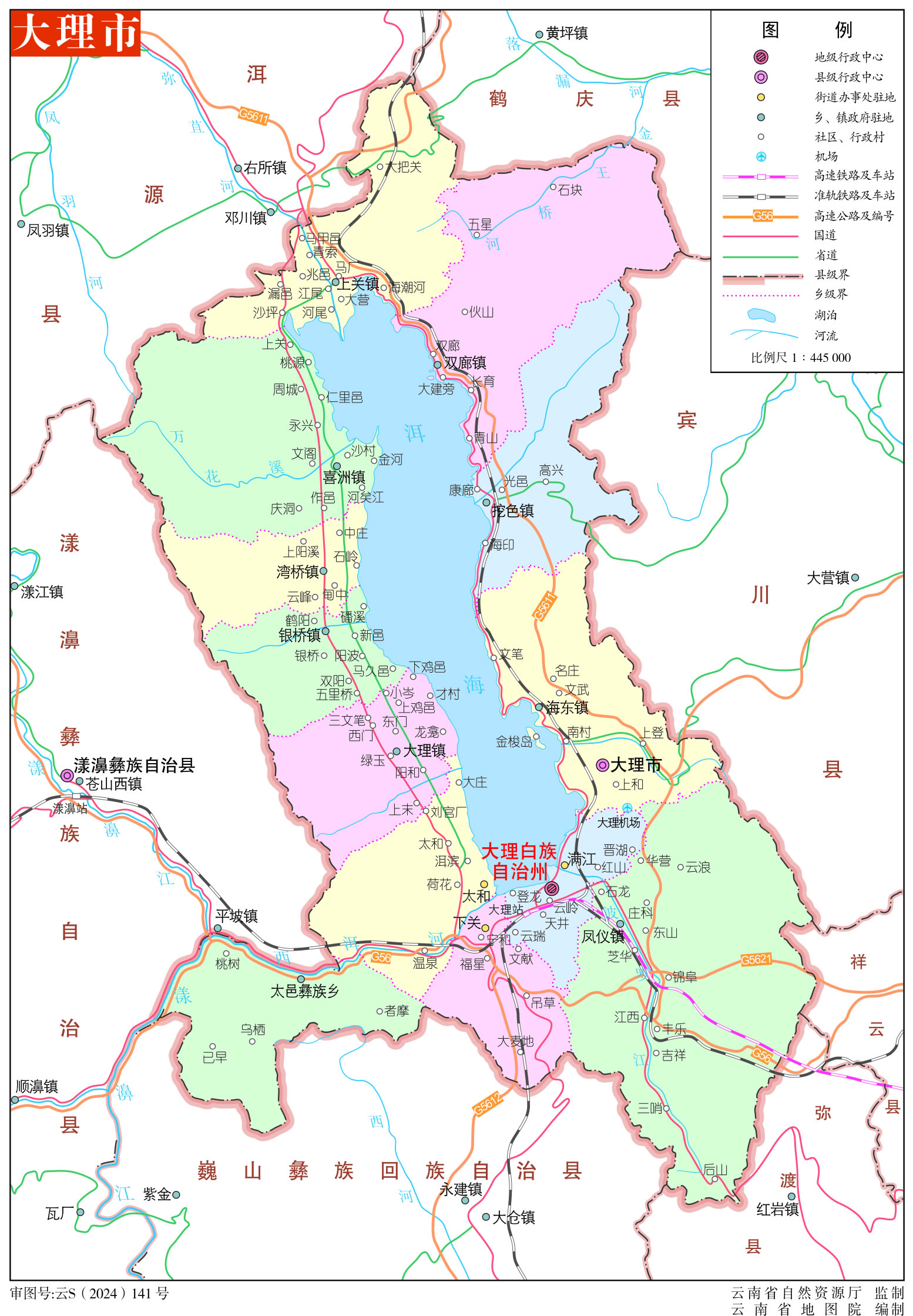 鎮(zhèn):大理鎮(zhèn)、鳳儀鎮(zhèn)、喜洲鎮(zhèn)、海東鎮(zhèn)、挖色鎮(zhèn)、灣橋鎮(zhèn)、銀橋鎮(zhèn)、雙廊鎮(zhèn)、上關(guān)鎮(zhèn)